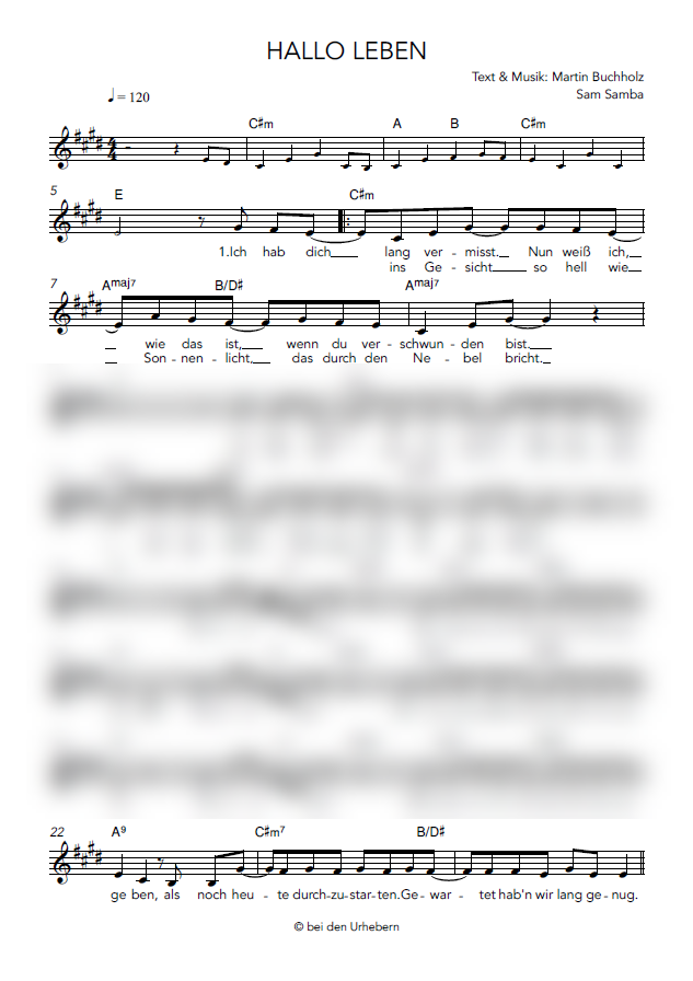 Hinweis: Sie erwerben mit dem Download das Recht, das Lied einmal für Ihren eigenen Gebrauch auszudrucken. Wenn Sie mehrere Notenausdrucke (z.B. für einen Chor) brauchen, appellieren wir an Ihre Fairness: Bitte kaufen Sie dann mehrere Ausdruckrechte. Bitte helfen Sie mit, dass Autoren und Verlag auch zukünftig Musik publizieren können. Herzlichen Dank.